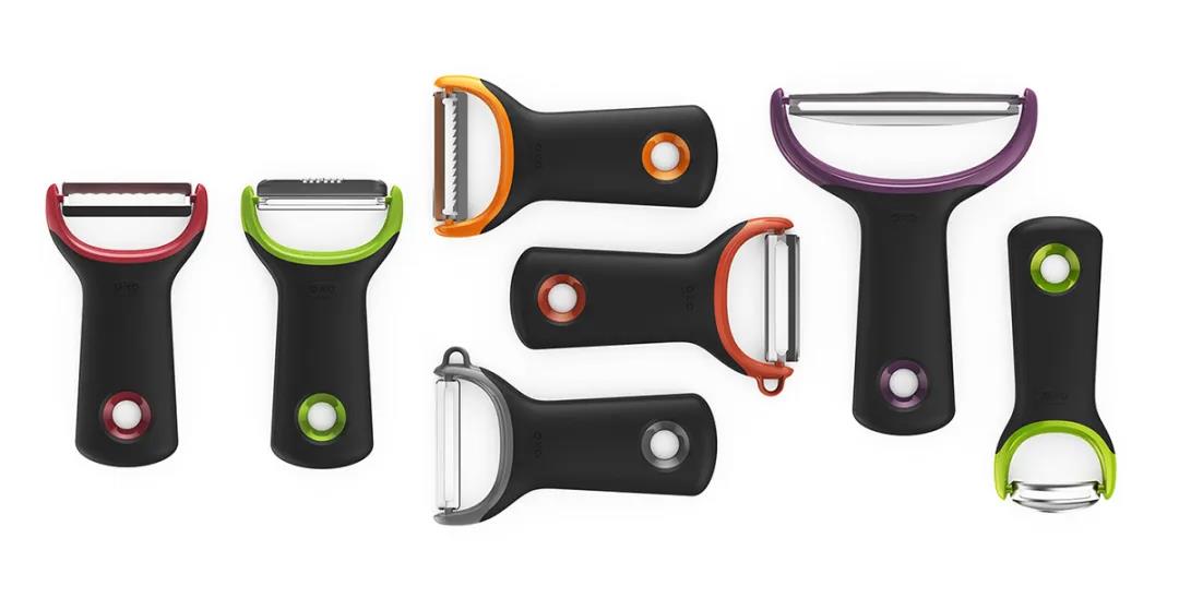 01-系列削皮刀,黑灰色的主體搭配鮮亮的彩色,給人清晰的功能指示,掛孔和刀片(同時具有警示作用)by: OXO